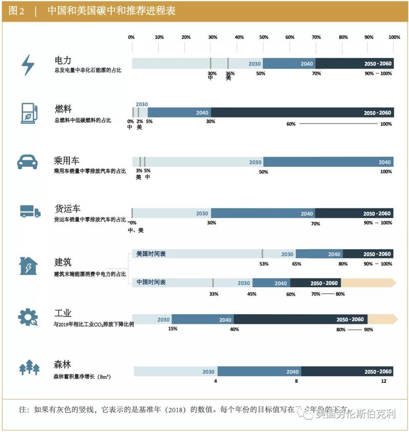 这份报告为中国和美国2030, 2040, 和2050-2050年提供了在七个领域上的进度表和目标水平(图2)。在每个领域里,我们向中国和美国建议的目标基本上是相同的,并且和中国国家与省份的政策,美国州层面的政策和联邦层面规划中的政策,以及两国长期碳中和目标一致。共同目标水平的好处就在于它十分简明。退一步讲,就算中国和美国为这个时间表选择了不同的目标水平,拥有双方共同决定的衡量进程的方法本身已经非常重要。这些进度标尺可以引导国家和州、省层面的政策,也可以随着时间被不断适应与更新。