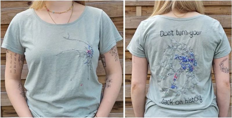 街道名称作为普遍存在但常被忽略的文化符号,其命名模式反映了社会权力结构,而女性在其中常处于边缘化或被忽视的状态。来自德国社会语言学实验室的Hannah Sawall课题组制作了一件刺绣T恤,将街道名称中的性别差异可视化,旨在促进公众对街道命名与性别平等议题的关注和讨论。