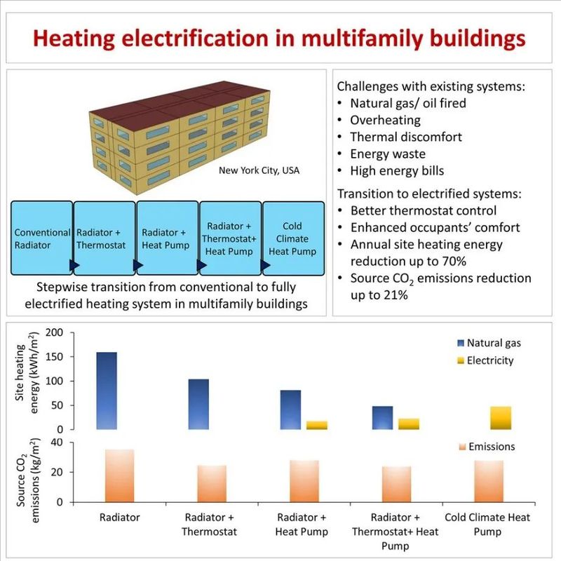 推动住宅供暖电气化是实现电网脱碳和应对气候变化的重要措施。当前,混合湿润气候区的多户住宅普遍采用天然气集中锅炉供暖,这种方式可能导致部分住户过热和能源浪费。基于此,来自美国国家可再生能源实验室Chuck Booten课题组以美国纽约市的一栋多户住宅为对象,评估了五种不同类型供暖系统的性能,这些系统代表了从传统锅炉向完全电气化供暖的过渡路径。研究分析了不同系统对现场能源消耗与源头二氧化碳排放的影响,结果显示:在现有供暖条件下,多户住宅内部最高可能出现超出舒适温度范围多达8°C的过热现象。而将传统蒸汽散热器系统替换为适用于寒冷气候的热泵系统,可使全年现场采暖能耗降低约70%,源头碳排放减少约21%。