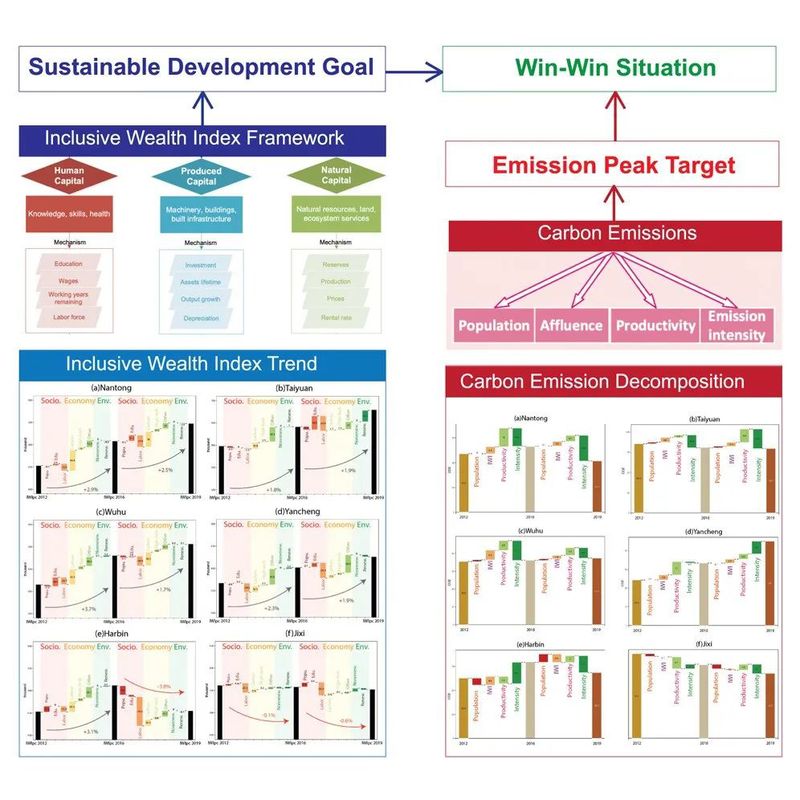 中国致力于推进可持续发展议程,并力争于2030年实现碳排放达峰。然而,但这两项目标间的关联及协同路径尚需系统研究。基于此,来自清华大学的关大博教授团队评估了中国城市的可持续发展绩效与碳排放特征,并深入分析了二者的关系。研究采用“包容性财富指数”(Inclusive Wealth Index)框架衡量可持续性,该框架综合评估经济体系的生产基础,包括物质资本、人力资本和自然资本。研究发现,2012-2019年间,部分国家级示范城市实现了碳排放下降伴随包容性财富增长(可称为“可持续达峰”)。这一现象主要与产业转型、教育水平提升及可再生能源增长相关。相比之下,一些东北地区城市通过缩减高碳产业实现排放下降,但未能发展替代产业支撑经济社会发展,导致整体福祉指标下滑。研究指出,城市需结合本地条件制定发展策略,以实现可持续性与碳达峰目标的协同推进。