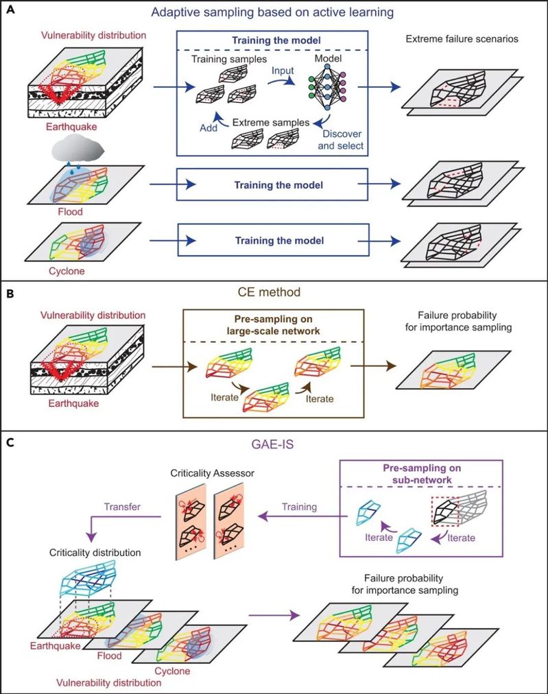 在复杂交通系统中量化小概率极端事件,对系统设计、可靠性及韧性评估至关重要。然而,由于极端事件发生概率低且系统性能模拟计算成本高,精确估计小概率失效事件具有挑战性。传统方法如重要性采样,在大规模网络中存在为众多组件构建重要性分布成本过高的问题。基于此,来自北京交通大学系统科学学院的高自友教授课题组提出了一种基于图学习的新方法——图自动编码器重要性采样(GAE-IS)。该方法将改进的图自动编码器(关键性评估器)与基于交叉熵的重要性采样技术相结合。GAE-IS能够区分组件在系统工作流中的“关键性”与其面对极端事件的“脆弱性”,并具有迁移潜力。该方法显著降低了大规模网络中进行重要性采样的计算成本。在多个道路网络案例中,GAE-IS将采样效率提高了1至2个数量级,并提升了小概率极端失效事件的估计精度。